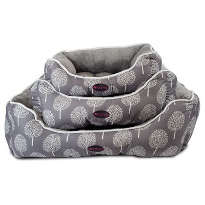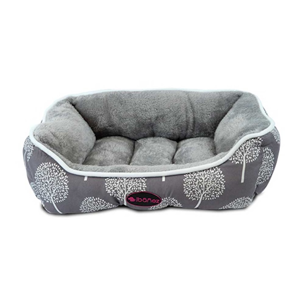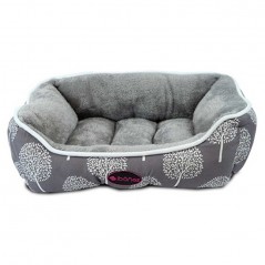 Esta cama es muy mullida y acogedora. Combina un interior muy suave en color gris, con el tejido exterior del mismo color pero estampado con bonitos árboles blancos.