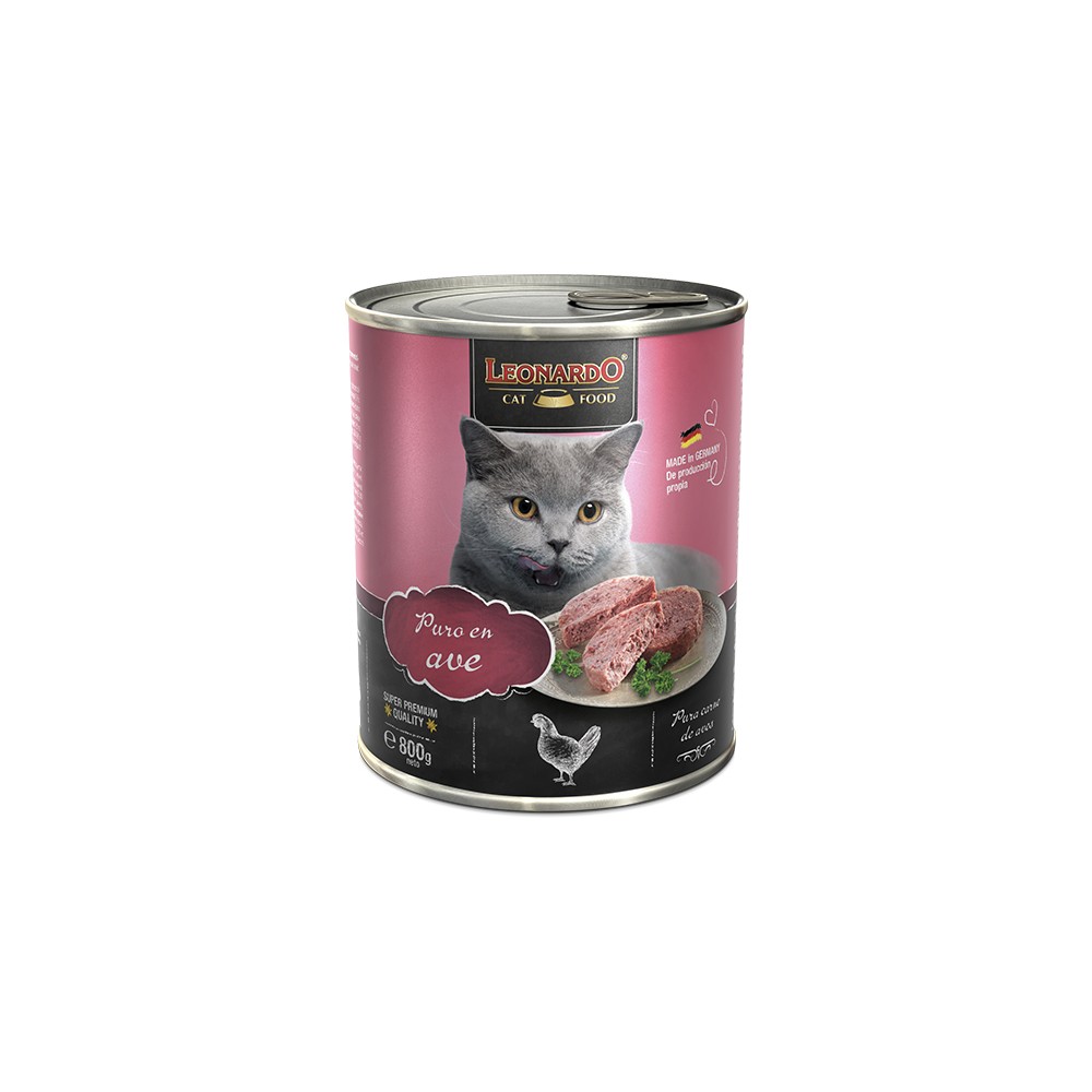 Leonardo Puro Ave, es nuestra gama mas económica para gatos. Con un 65% de carnes de Aves ( pollo, pato y pavo), sin cereales.