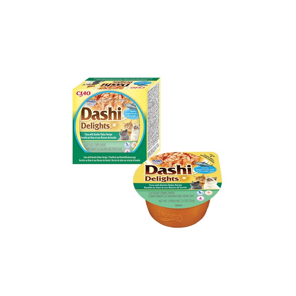 Dashi está elaborado con una receta única a partir de caldo de atún. Cada producto Inaba está hecho con deliciosos ingredientes de alta calidad, incluido pollo criado en granjas y/o atún silvestre natural.