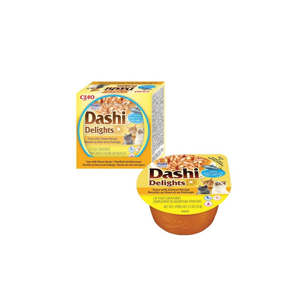 Dashi está elaborado con una receta única a partir de caldo de atún. Cada producto Inaba está hecho con deliciosos ingredientes de alta calidad, incluido pollo criado en granjas y/o atún silvestre natural.