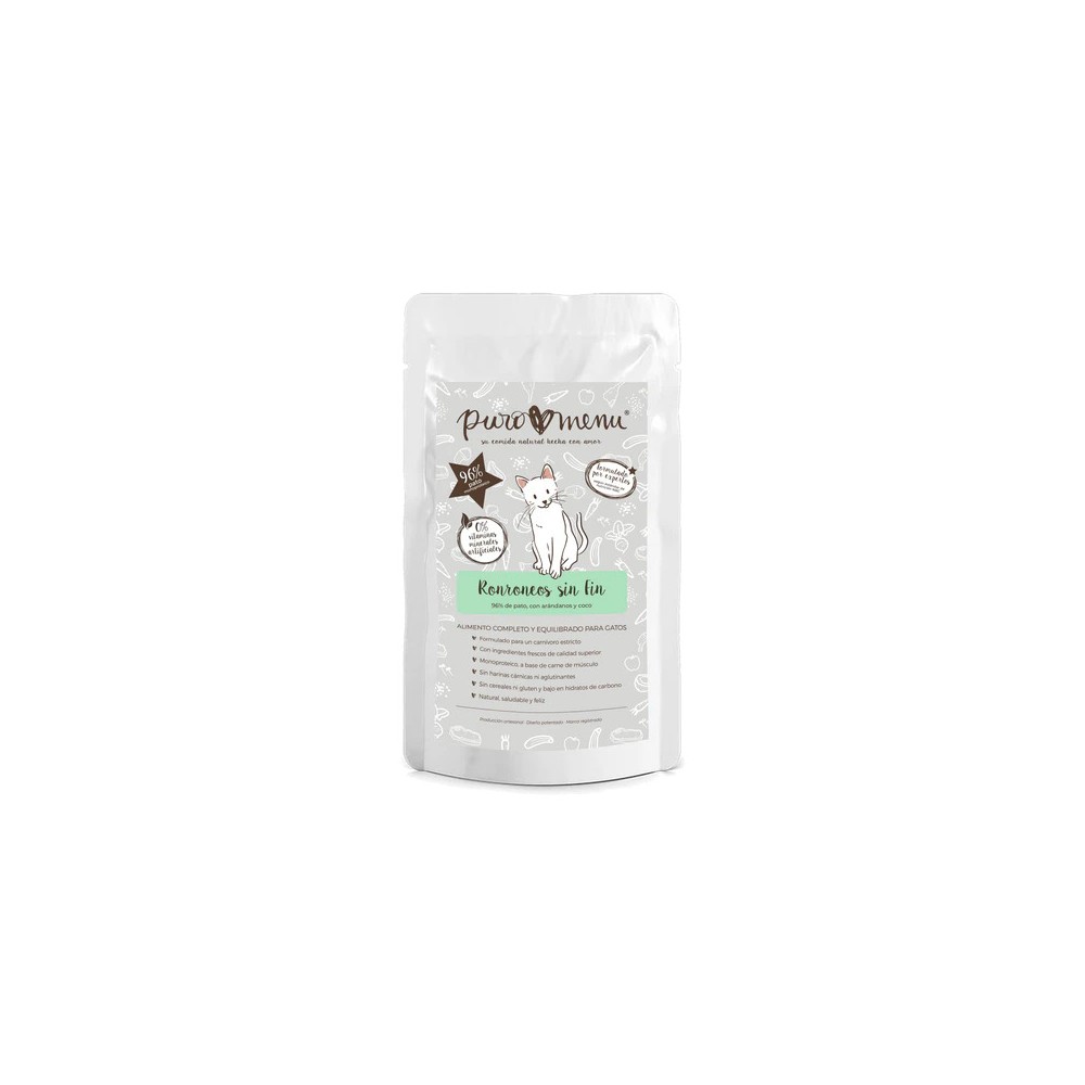 Un menú ecológico cocinado, completo y equilibrado para gatos y gatitos de cualquier raza96% de pato, con arándanos y coco.