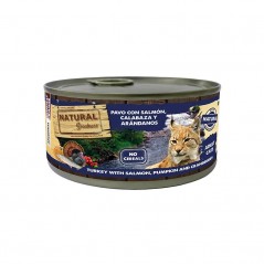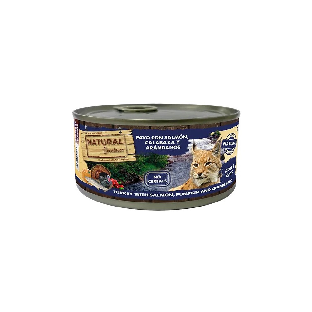 Natural Greatness PAVO CON SALMÓN, CALABAZA Y ARÁNDANOS es una excelente receta húmeda completa, ultra premium e hipoalergénica formulada sin cereales y desarrollada idealmente para gatos adultos. La receta incorpora carnes de alta calidad como lo son el pavo y el salmón, que aportan aminoácidos esenciales para garantizar la buena salud del gato. Destaca por su contenido en ácidos grasos omega 3 y 6, que otorgan a la piel y al pelaje del gato un aspecto sano y resplandeciente. También contiene una cantidad equilibrada de vitaminas y minerales gracias a la inclusión de la calabaza y los arándanos rojos a la receta.