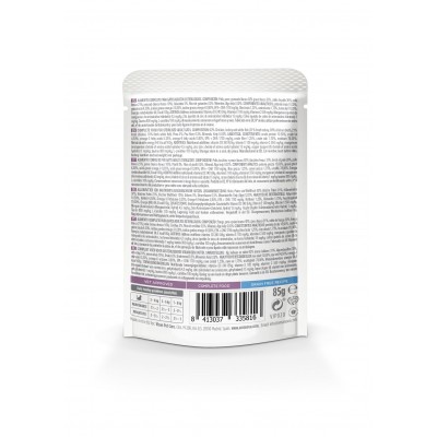 COMPONENTES ANALÍTICOS: proteína bruta 10,50%, grasa bruta 4,50%, ácidos grasos omega-3 0,35%, ácidos grasos omega-6 0,80%, EPA + DHA 1750 mg/kg, fibra bruta 1,25%, ceniza bruta 1,75%, humedad 78,00%. Energía metabolizable 94,5 kcal/kg.