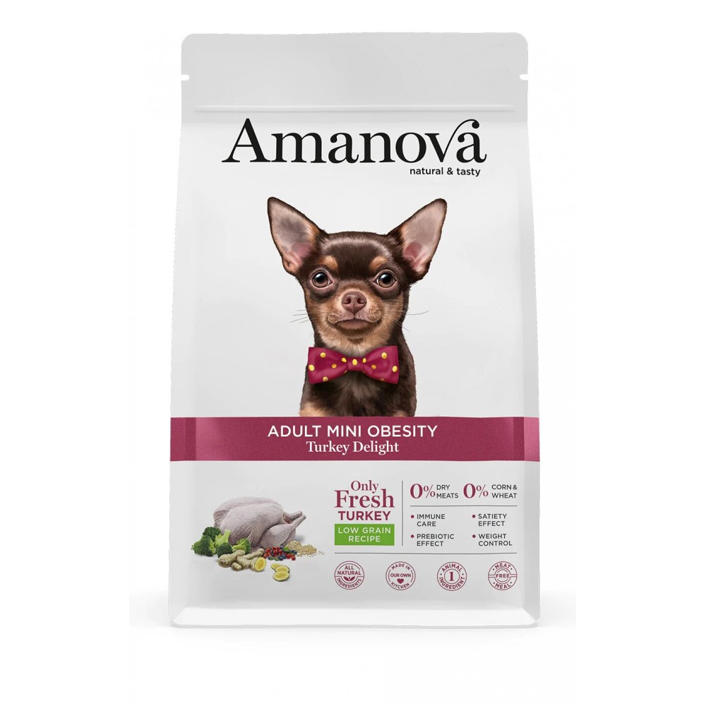 Amanova Adult Mini Obesity es un pienso hipoalergénico bajo en grasas y elaborado con pavo fresco como única fuente animal, una deliciosa carne rica en proteínas, baja en grasas y colesterol.