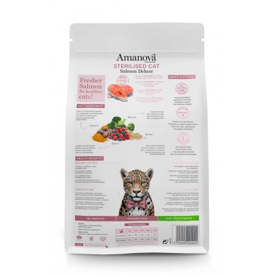 Amanova Sterilised Salmon Deluxe es una receta exclusiva de comida natural para gatos esterilizados, sin harinas de carne ni carnes deshidratadas, contiene minerales, fibras dietéticas e ingredientes especiales como psyllium, probióticos, quinoa y aceite de pescado que ayudará a mejorar la función renal, la digestión y a prevenir la formación de bolas de pelo.