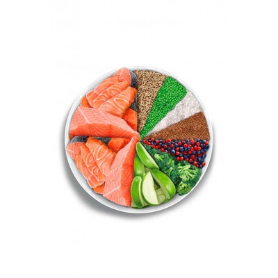 COMPOSICIÓN: salmón preparado en fresco 55% (usamos 85 kg de salmón preparado en fresco para producir 100 kg de nuestro producto), guisantes verdes enteros, proteína de patata, proteína de arroz, fibra de manzana, levaduras (Saccharomyces cerevisiae), hidrolizado de pescado, minerales, lignocelulosa, proteína de guisantes, arroz integral, tapioca, psyllium, malta de cebada en polvo, calabaza deshidratada, kale deshidratada, krill del antártico, alga kelp, spirulina, pared celular hidrolizada de levaduras (fuente de MOS) 1000 mg/kg, achicoria (fuente de FOS) 1000 mg/kg, quínoa 1000 mg/kg, brócoli deshidratado 1000 mg/kg, arándanos azules 1000 mg/kg, arándanos rojos 1000 mg/kg, jengibre, extracto de mandarina,  cúrcuma 500 mg/kg, romero, Yucca schidigera.