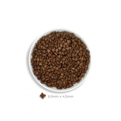 COMPOSICIÓN:pollo preparado en fresco 66% (usamos 120 kg de pollo preparado en fresco para producir 100 kg de nuestro producto), guisantes verdes enteros, proteína de patata, semillas de lino (fuente natural de ácidos grasos ω3), levaduras (Saccharomyces cerevisiae), arroz integral, hidrolizado de hígado de pollo, aceite de pollo (protegido con tocoferoles naturales), minerales, proteína de guisantes, tapioca, fibra de manzana 4000 mg/kg, aceite de pescado (protegido con tocoferoles naturales), calabaza deshidratada, kale deshidratada, krill del antártico, alga kelp, spirulina, quínoa 1000 mg/kg, zanahoria deshidratada 1000 mg/kg, arándanos rojos, achicoria (fuente de FOS) 1000 mg/kg, pared celular hidrolizada de levaduras (fuente de MOS) 1000 mg/kg, extracto de mandarina, menta 500 mg/kg, jengibre, romero.
